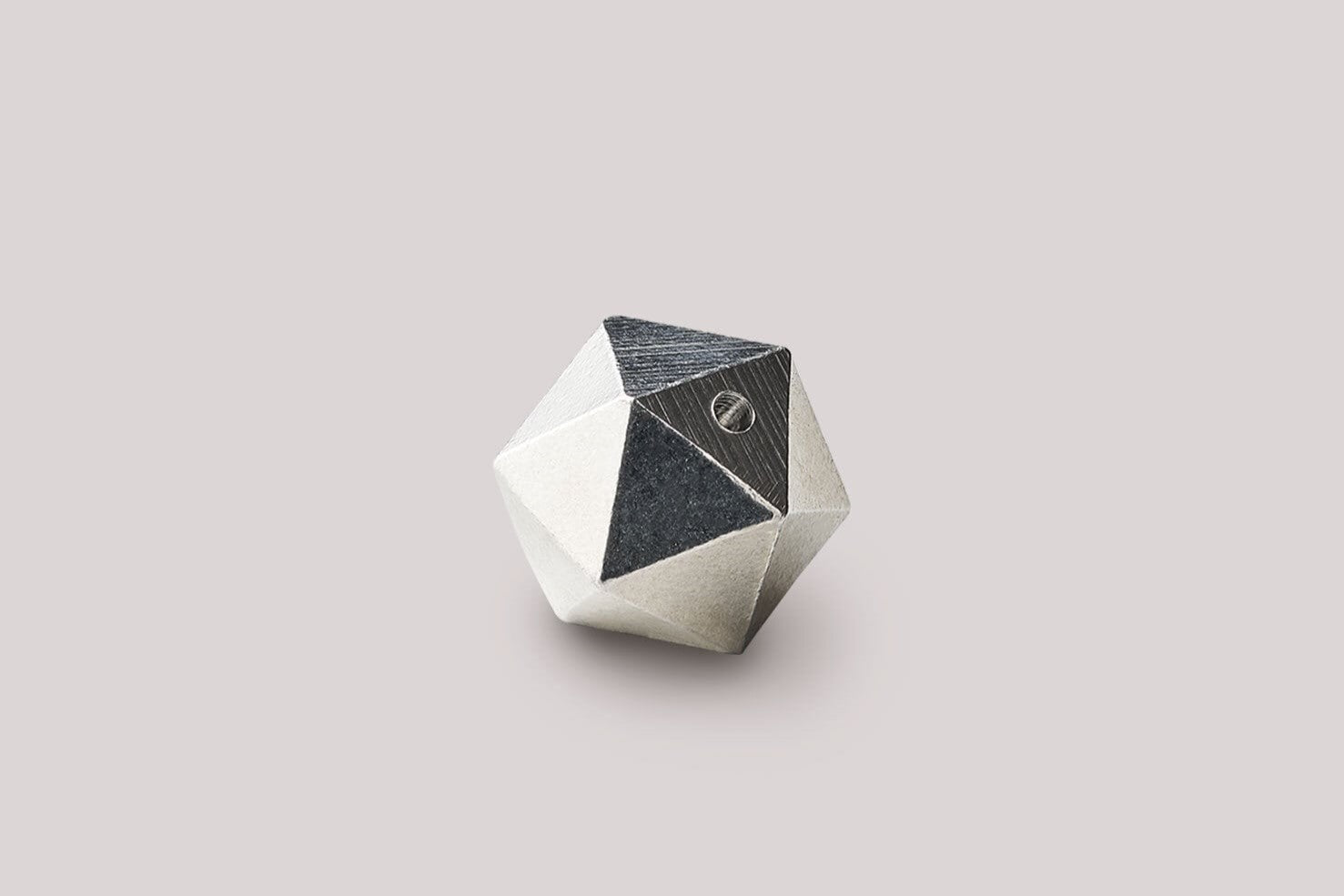 正三角形20枚の面で構成された正二十面体は最大の面数を持つ正多面体です。シンプルなフォルムでありながら、どの角度から見ても複数の面が見え、光の反射の違いにより様々な表情を見せます。正二十面体は、正四面体、正六面体(立方体)、正八面体、正十二面体とともに、5つの「プラトンの立体」のひとつです。古代ギリシャの哲学者プラトンは、これらの形を宇宙の基本要素と関連付けました。お香立てそのものが神秘的なオブジェのようです。